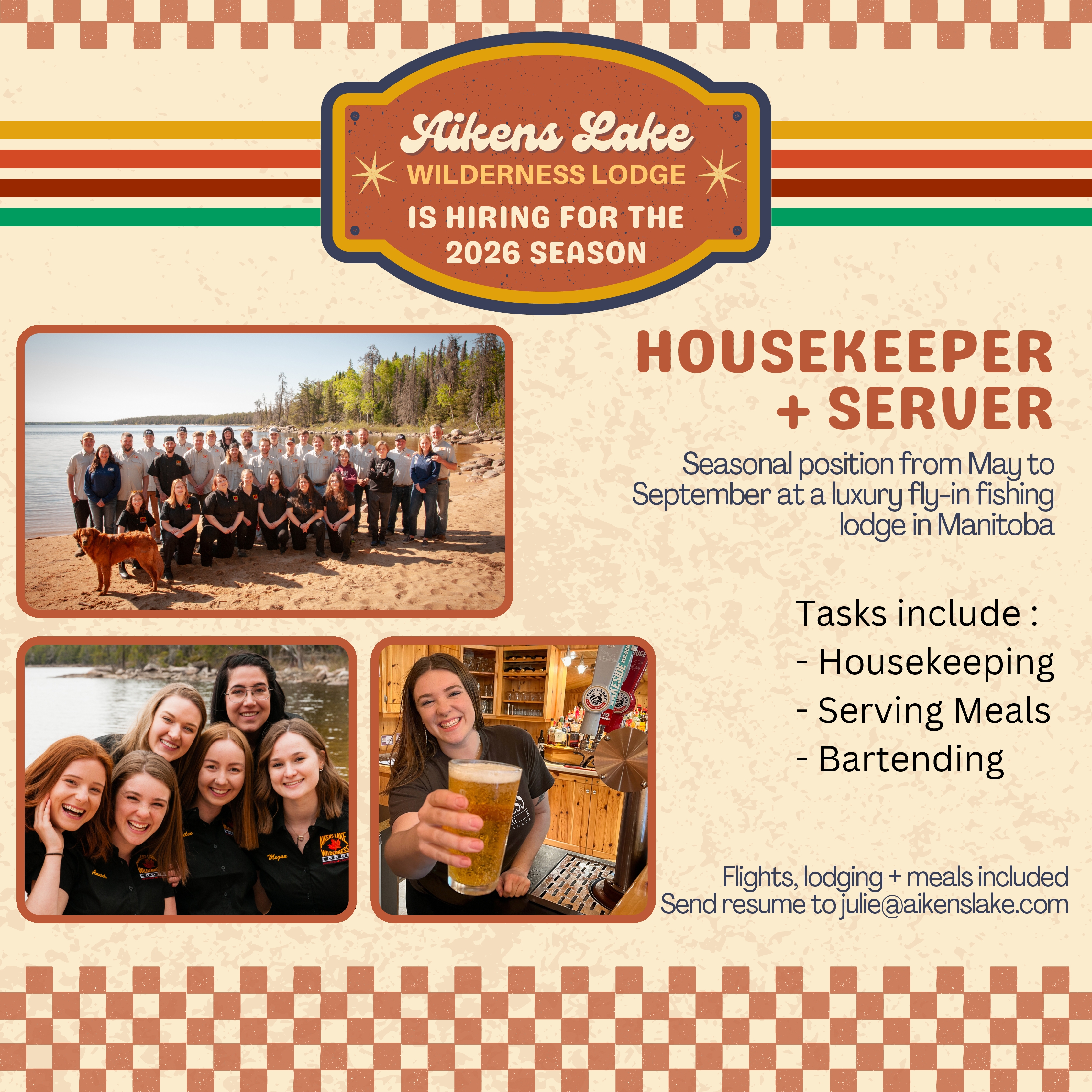 Housekeeper/Server: If you enjoy having fun at work, working as part of a close-knit team, and take pride in providing great service, this could be the perfect summer job for you! We are now accepting applications for the 2026 season.